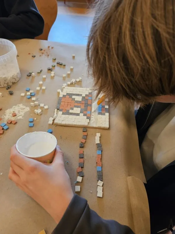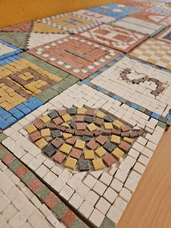 Auf kleinen Tafeln entsteht ein selbstgelegtes kleines Mosaik aus bunten Keramiksteinchen. So können die Kinder die faszinierende Welt der "Bilder aus Stein", die auch heute noch im ganzen ehemaligen römischen Reich als Fußbodendekoration zu finden sind, mit den eigenen Händen nachbilden und als schöne Erinnerung mit nach Hause nehmen. + 6,00 € Materialkosten pro Person |